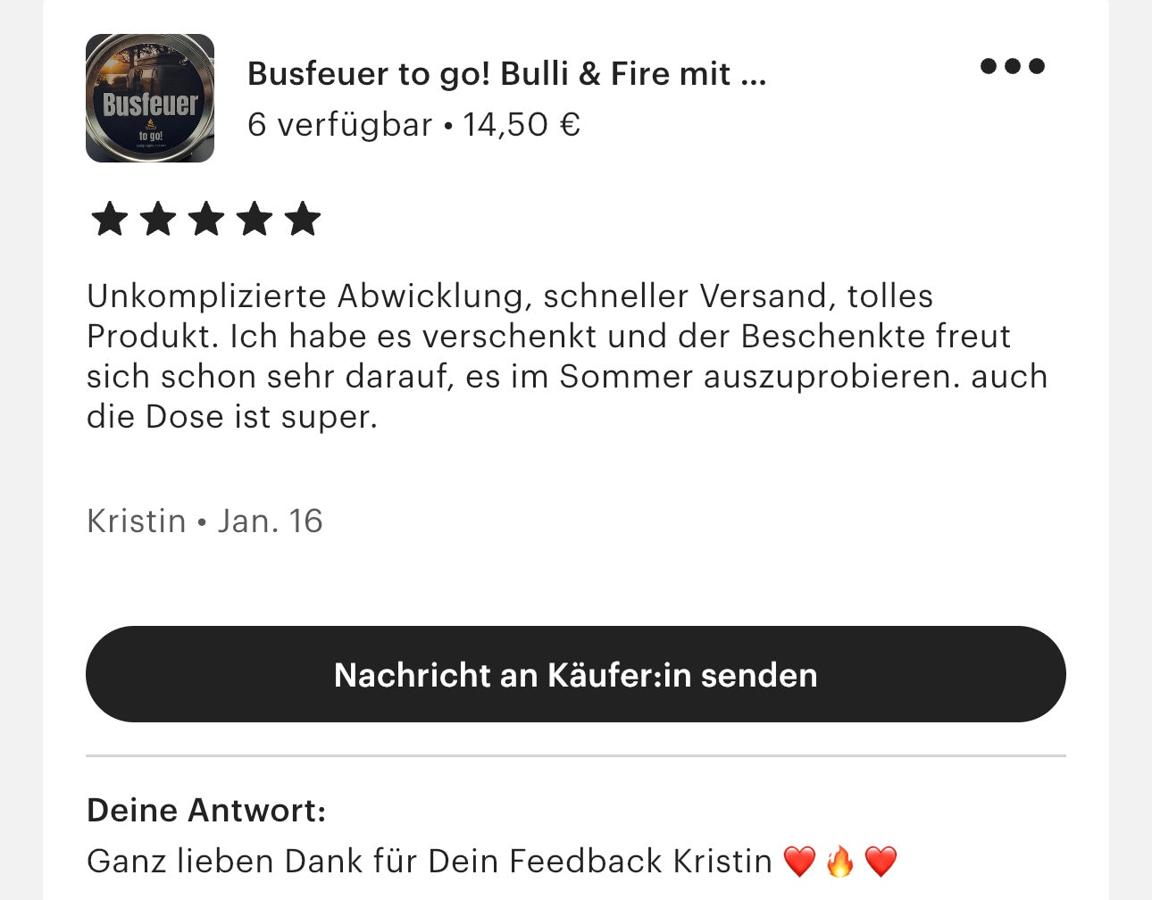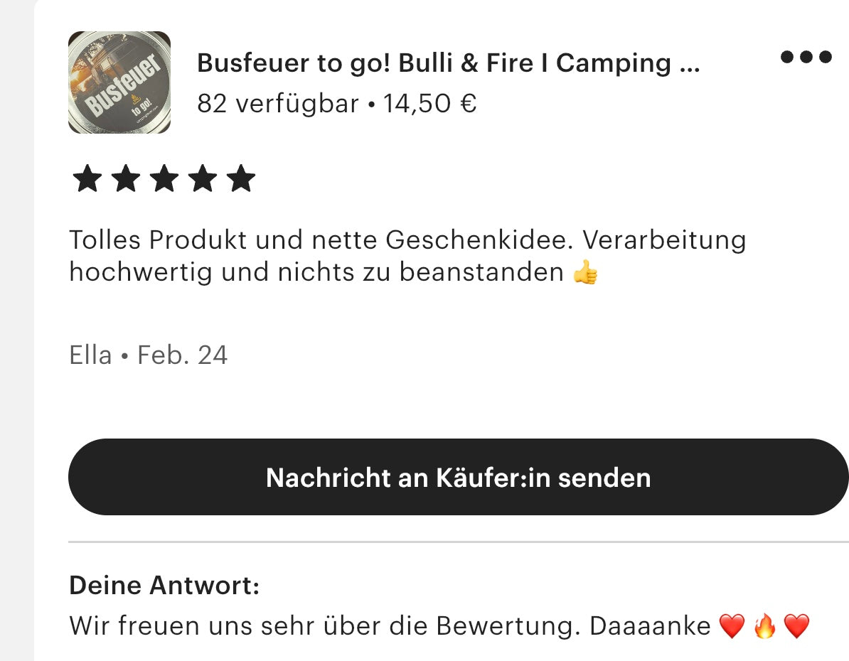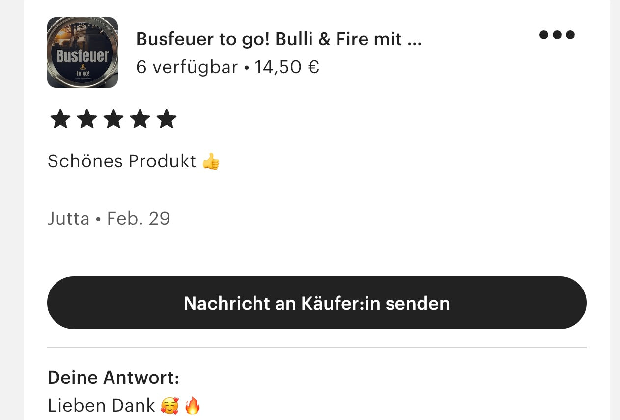 Speziell für alle Bulli- & Vancamper: Dein BUSFEUER & Dein Vanfeuer to go! Wir freuen uns sehr, dass sich schon nach den ersten Tagen im Shop zeigt: wir haben neue Bestseller. Danke für die vielen Bestellungen!