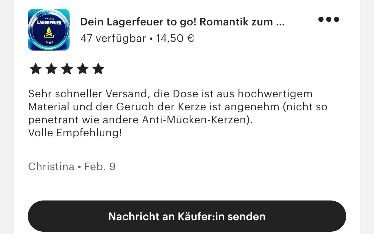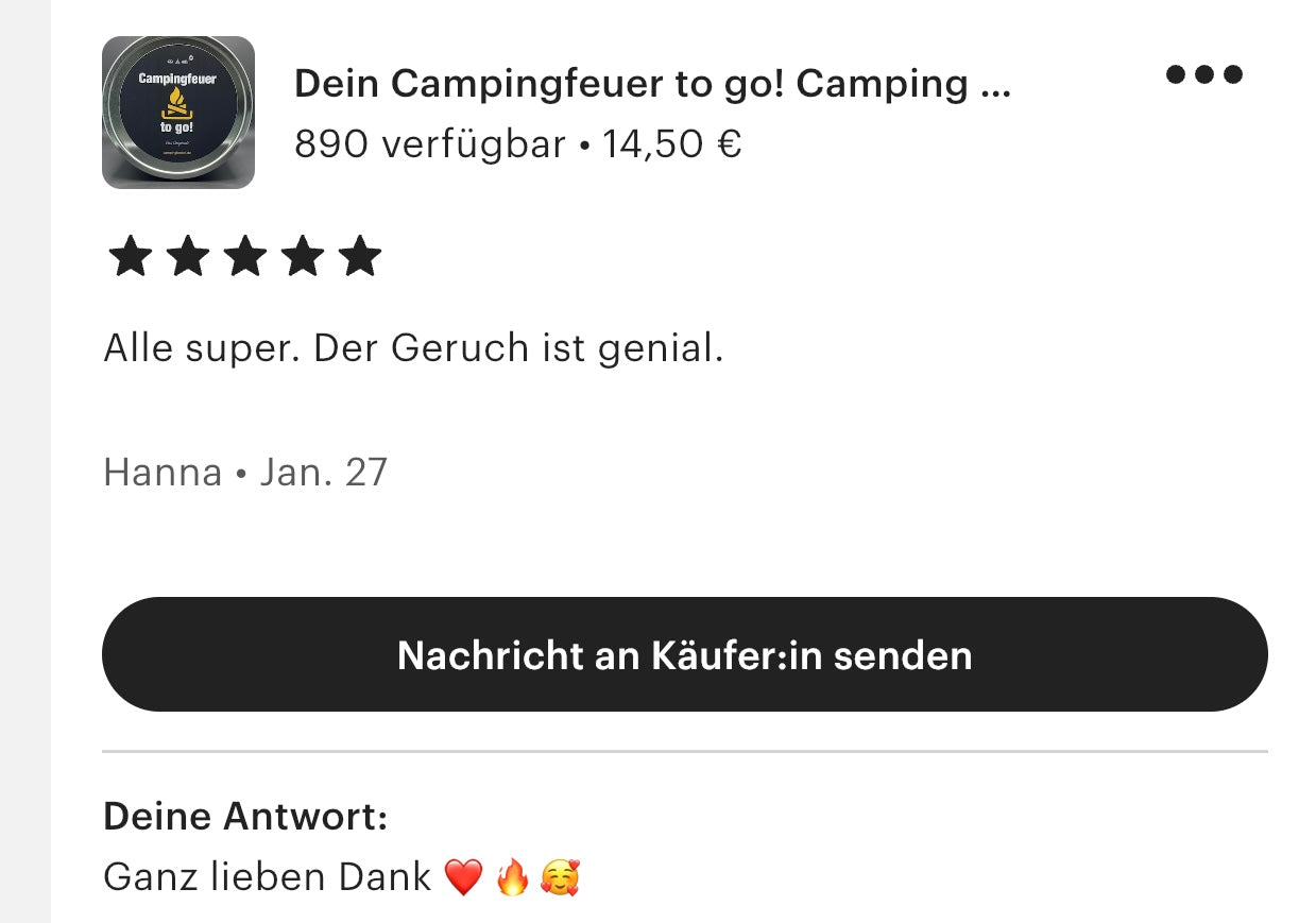 Hey, wir sind die Neuen! Caravan Campingfeuer & Zeltfeuer. Du bekommst uns jeweils mit Mückenschutz oder im Lagerfeuerstyle mit herrlicher Holznote.