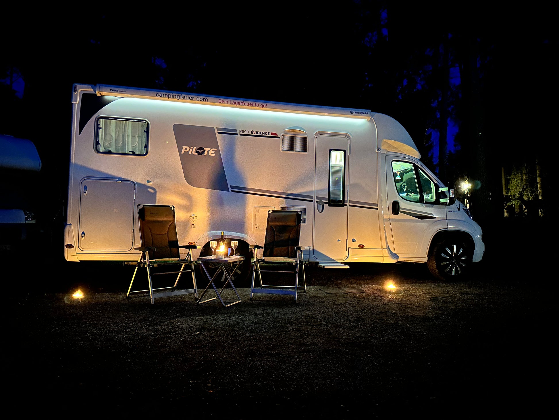 Das hat nicht jeder. Die Flamme unseres Camping-Lagerfeuers wirft ein einzigartiges Licht auf Wohnwagen & Wohnmobil. Romantik pur an den schönsten Abendstunden!